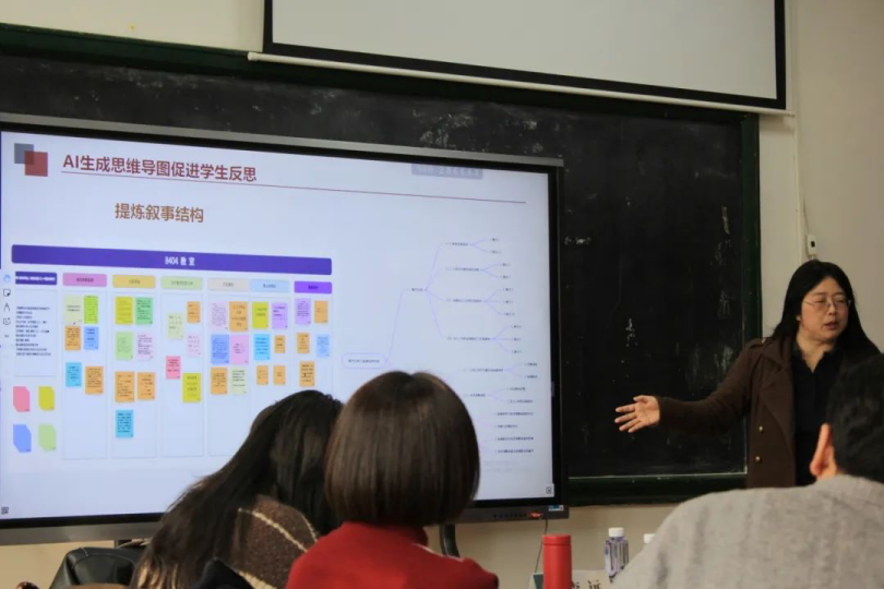 徐敏老师以《文学批评》课程为例,介绍了基于数字画布的生成式教学探索情况。她指出,数字画布的可视化特点以及AI功能生成的思维导图有利于加强学生反思,其便签设计便于学生修正探索,生成的概要则便于教师迅速把握学情。数字画布的平铺设计与点赞功能提高了学生的可见度,从而进一步支持学生为主体的教学改革与探索。