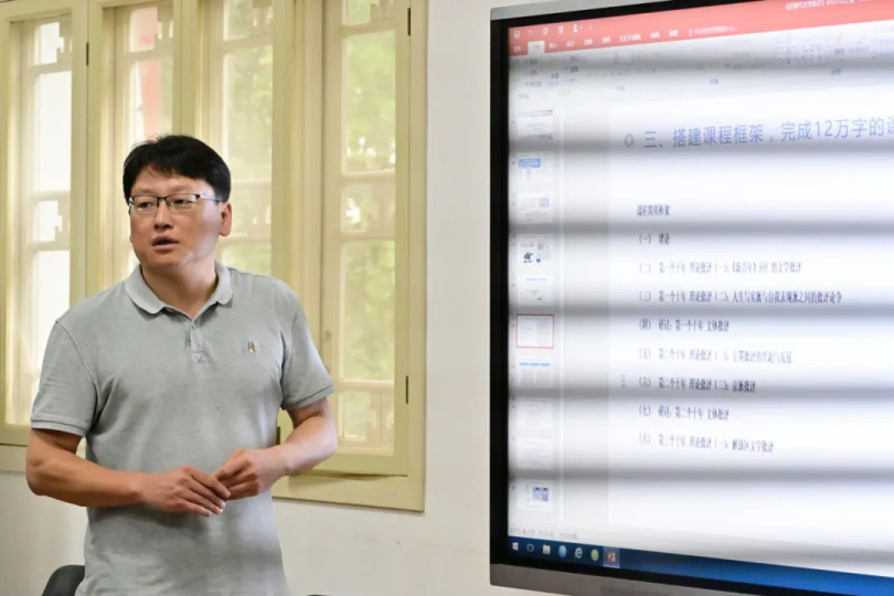 刘涛老师汇报了“中国近代文学批评”课程当前的建设进度。在资源库建设方面,已完成部分文献的搜集整理及详细目录编制。在课程微视频方面,已撰写完成课程微视频脚本,并制作了部分微视频。在课程内容方面,已撰写了部分课程讲稿。除此之外,课程组完成了一篇课程教学论文。未来,“中国近现代文学批评课程”将进一步完善资源库建设,制作课程PPT和微视频,并编写课程教材。
