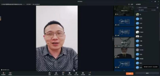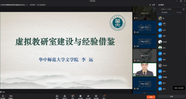 我院李远老师对其他虚拟教研室建设中可借鉴的经验进行了主题汇报。他从课程群虚拟教研室的基本介绍、建设框架、建设案例分析三个方面进行了讲解,指出虚拟教研室的建设框架包括团队建设、平台建设、机制建设、内容建设四个维度,并结合计算思维导论课程虚拟教研室、“设计+X”创新创业教育改革虚拟教研室、工程图学课程虚拟教研室三个具体案例进行了全面的分析,为文学批评虚拟教研室后续建设提出建议。