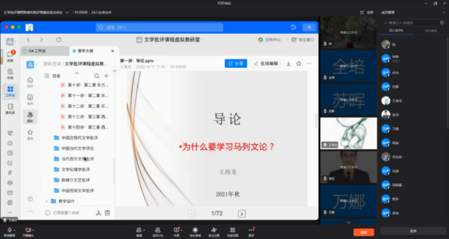 我院王海龙老师介绍了马克思主义文学批评课程的基本建设情况。他具体介绍了虚拟教研室信息平台中“马克思主义文学批评课程”的专题资源建设概况,包括教学大纲、教学计划、教学课件、阅读资料、作业习题等线上资源。同时,王海龙结合近年来《马列文论》等课程的教学实施情况对虚拟教研室未来的建设进行了构想,提出了符合教学实际的建议。