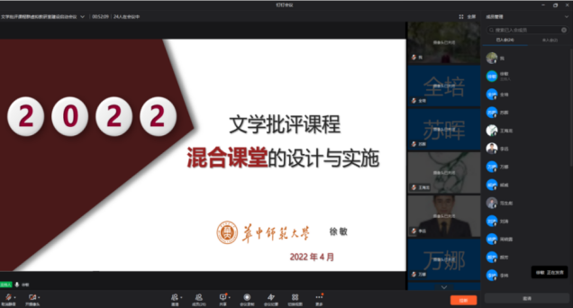 (通讯员 宋时雨)2022年2月,教育部办公厅公布全国首批虚拟教研室建设试点名单,确定首批虚拟教研室建设试点439个,其中课程(群)教学类237个,我院胡亚敏教授牵头申报的华中师范大学文学批评课程虚拟教研室获批建设。为深入贯彻全国教育大会精神和《中国教育现代化2035》,落实立德树人的根本任务,扩大信息化教研辐射与示范作用,4月21日晚上,文学批评课程虚拟教研室建设启动会议在虚拟教研室信息平台成功召开。本科生院副院长胡中波、文学院王洪涌副院长、高等教育出版社罗京、我校虚拟教研室负责人及团队成员、西藏大学、贵州师范大学、青海师范大学、长江师范学院和长江大学的负责人、成员老师等20余人线上参会。会议由徐敏教授主持。