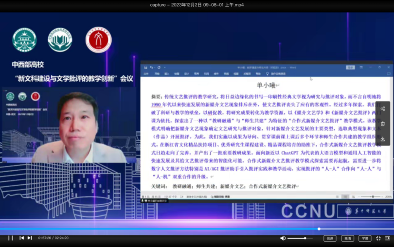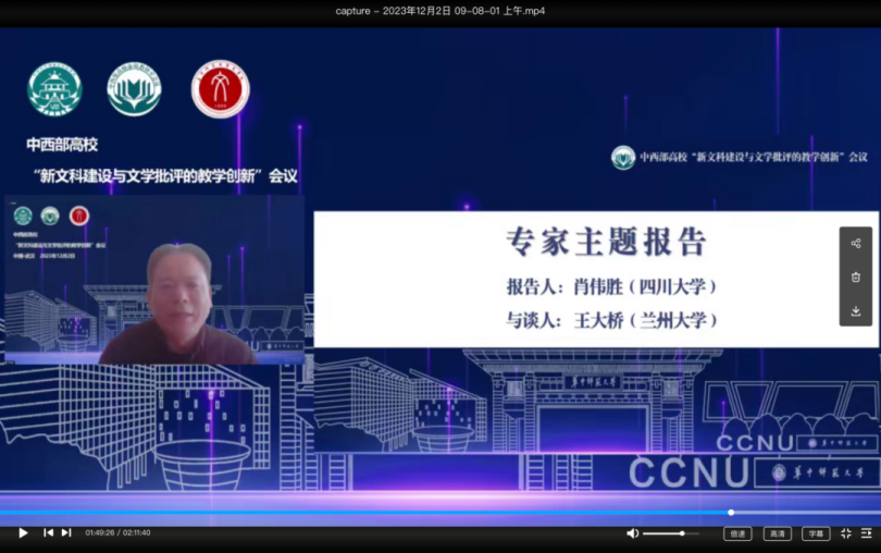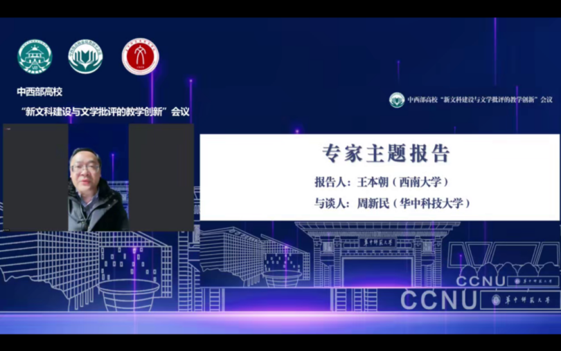 (通讯员:孙志威 梁靖羚)2023年12月2日,中西部高校“新文科建设与文学批评的教学创新”会议在华中师范大学成功举办。本次会议由华中师范大学文学批评课程虚拟教研室、湖北文学理论与批评研究中心、华中师范大学文学研究所主办。会议共有来自四川大学、兰州大学、重庆大学、西南大学、西藏大学、贵州大学、广西师范大学、青海师范大学、新疆财经大学、喀什大学、大理大学等30余所中西部高校的150余名师生参与。会议通过线上线下相结合的方式交流互动,线上参与人数逾3000人次。