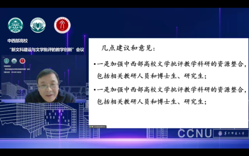 王本朝教授在题为“关于新文科背景下文学批评虚拟教研室资源开发的建议”的报告中,提倡各位专家学者结合自己的专业来谈虚拟教研室,并且认为虚拟教研室的意义重大,可以让不同区域、不同学科、不同学校的专业教师,借助信息技术平台开展协同教学研究与改革创新;新文科的理念,对中西部高校很有必要性和可行性,“文学批评虚拟教研室”就充分体现了新文科发展理念。他提出了几点建议和意见,一是加强中西部高校文学批评教学科研的资源整合;二是定期开展活动,推动虚拟教研室建设;三是打破原有的以大学课程为中心的教研活动形式,建议以文学批评“问题”为中心开展教研形态;四是在由华中师范大学文学批评虚拟教研室的统一主持、策划和安排下,可由中西部高校相关人员轮流主持相关教研活动。