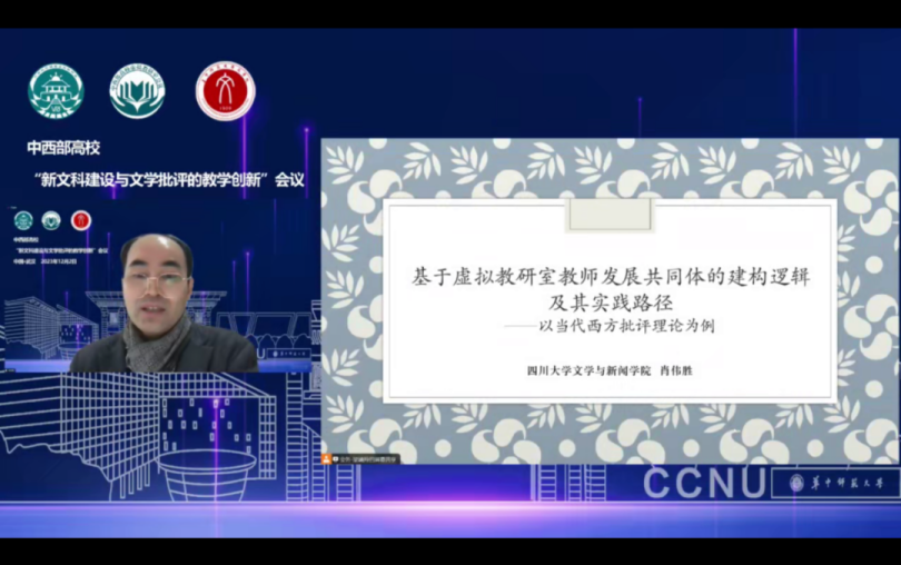 肖伟胜教授在题为“基于虚拟教研室教师发展共同体的建构逻辑与实践路径研究——以当代西方批评理论为例”的报告中,指出针对当代西方批评理论流派林立、纷繁复杂的情况,同时对本土学生面临文化差异、语言媒介、思维模式转换以及时间转换等问题,倡导应在具体教学实践活动中实行教学策略和举措,首先要打通当代西方文学批评理论与文学作品之间的关系,培养学生诗性思维和抽象思维并举的能力;其次要打通语言关,回归当代西方文学批评理论衍生的文化语境,培养学生的元典精神;最后是比较视域的建立与中西批评理论的跨文化对话,培养学生的批评质疑和创新精神。他给出创建虚拟教研室的具体方法,要依靠平台支撑,将组织虚拟化,采用“线上为主,线下为辅”的运行模式,加大教研产出和实践成果,并且借助分布式认知理论为虚拟教研室的发展提供新思路。